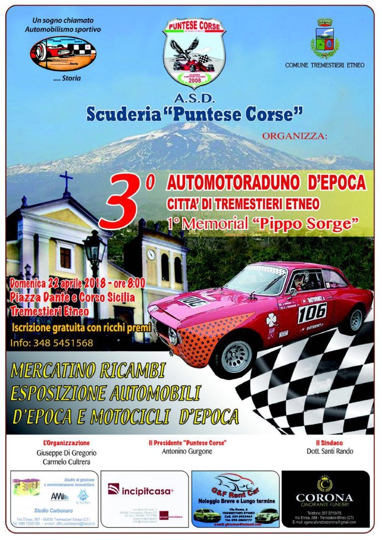 Il Catania Club Alfa Romeo è stato ufficialmente invitato al 3° Automotoraduno d’epoca – Città di Tremestieri Etneo, 1° Memorial Pippo Sorge. Grazie alla Scuderia Puntese Corse, all’organizzatore Giuseppe Di Gregorio, al Sindaco di Tremestieri Etneo Dott. Santi Rando e…